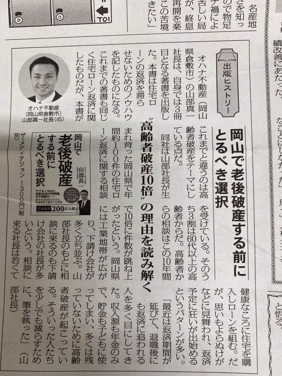 岡山県南地区を中心に住宅ローンの支払いが困難な人に向けた相談業務などを展開しており、このほど3冊目となる書籍「岡山で老後破産する前にとるべき選択」(㈱メディアジョン刊)を発刊した。山部社長は「社会の不安定化や不透明の中、老後を控えた50歳代のほか団塊ジュニア世代の人にも老後の対策として情報を啓発したい」と話す。