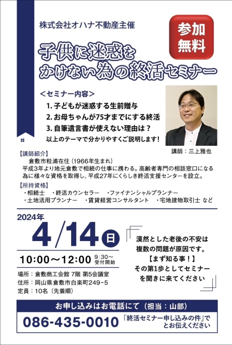 くらしき終活支援センターの代表、相続士の三上雅也氏を講師に迎え、「子供に迷惑をかけない為の終活セミナー」を開催します。
